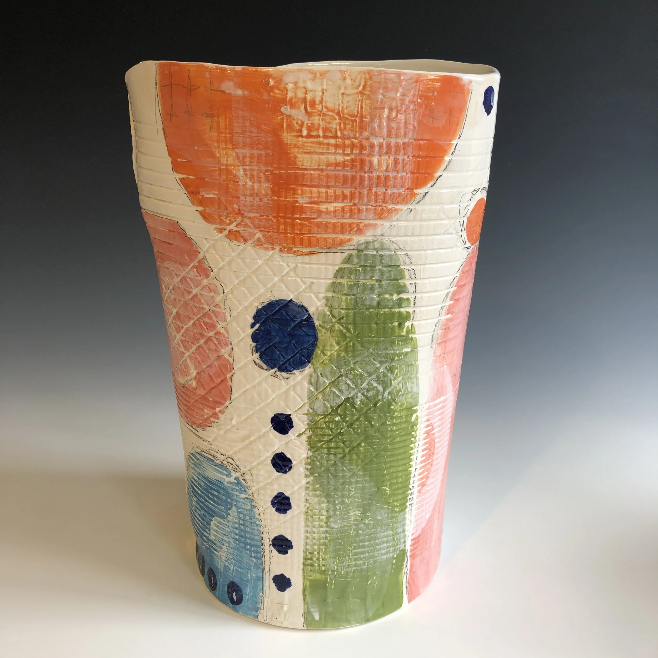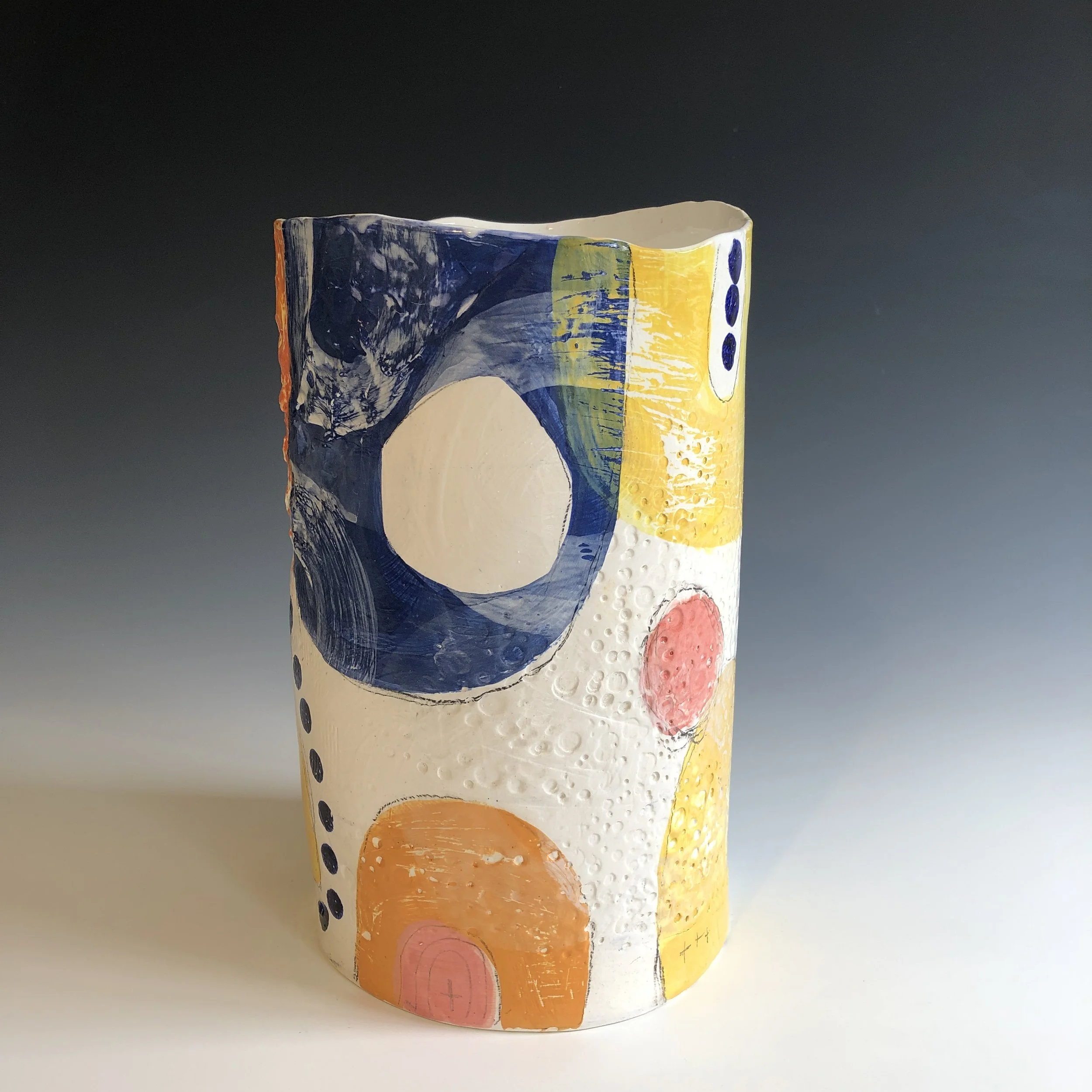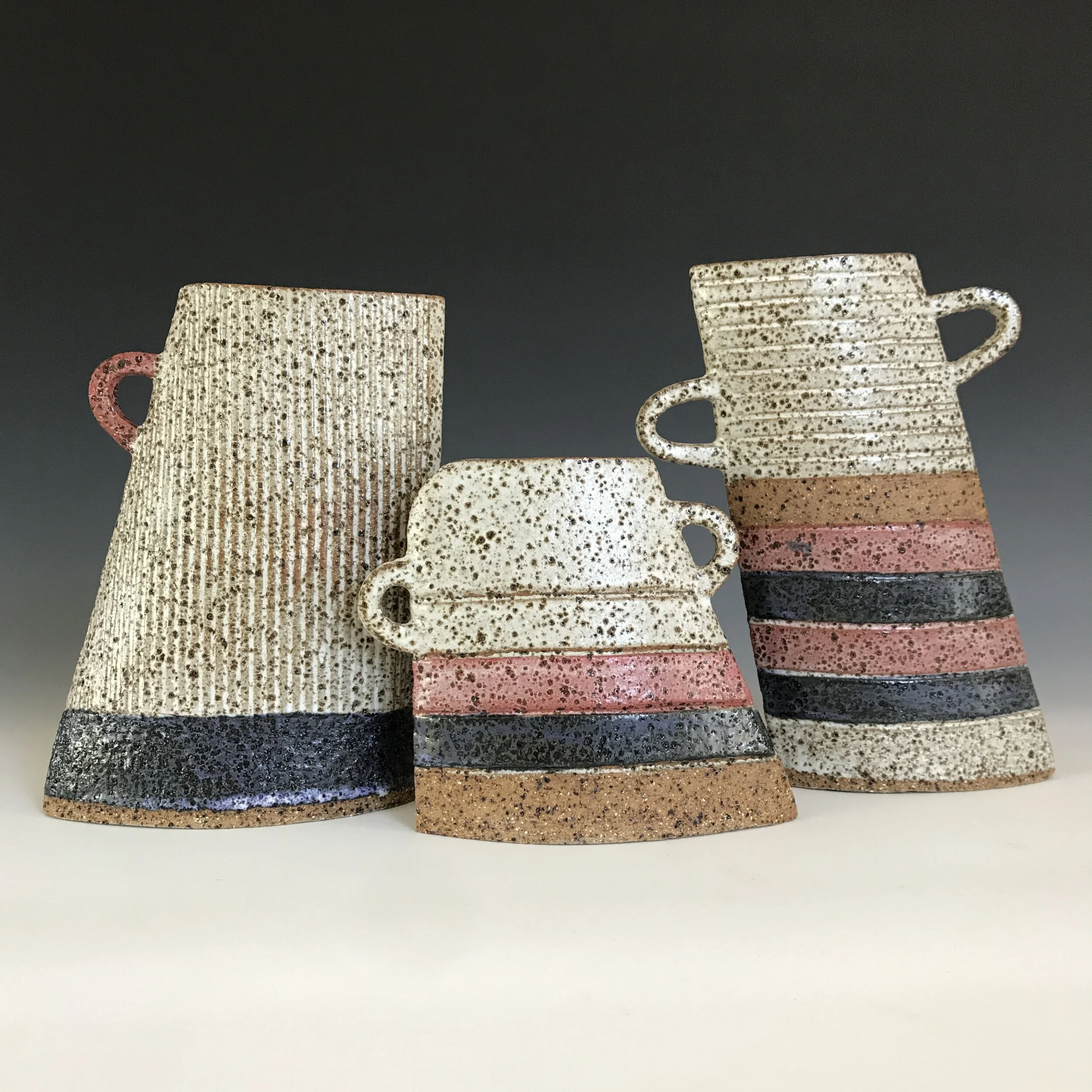 Distorted vessles are squashed and moulded to look crumpled with glazes that are layered running into each other to look lush and volcanic.