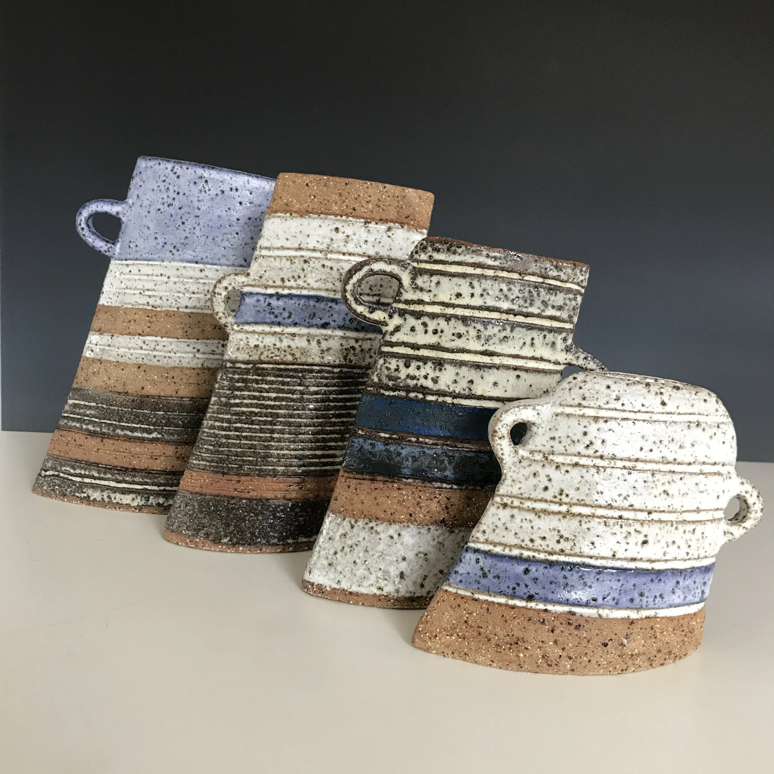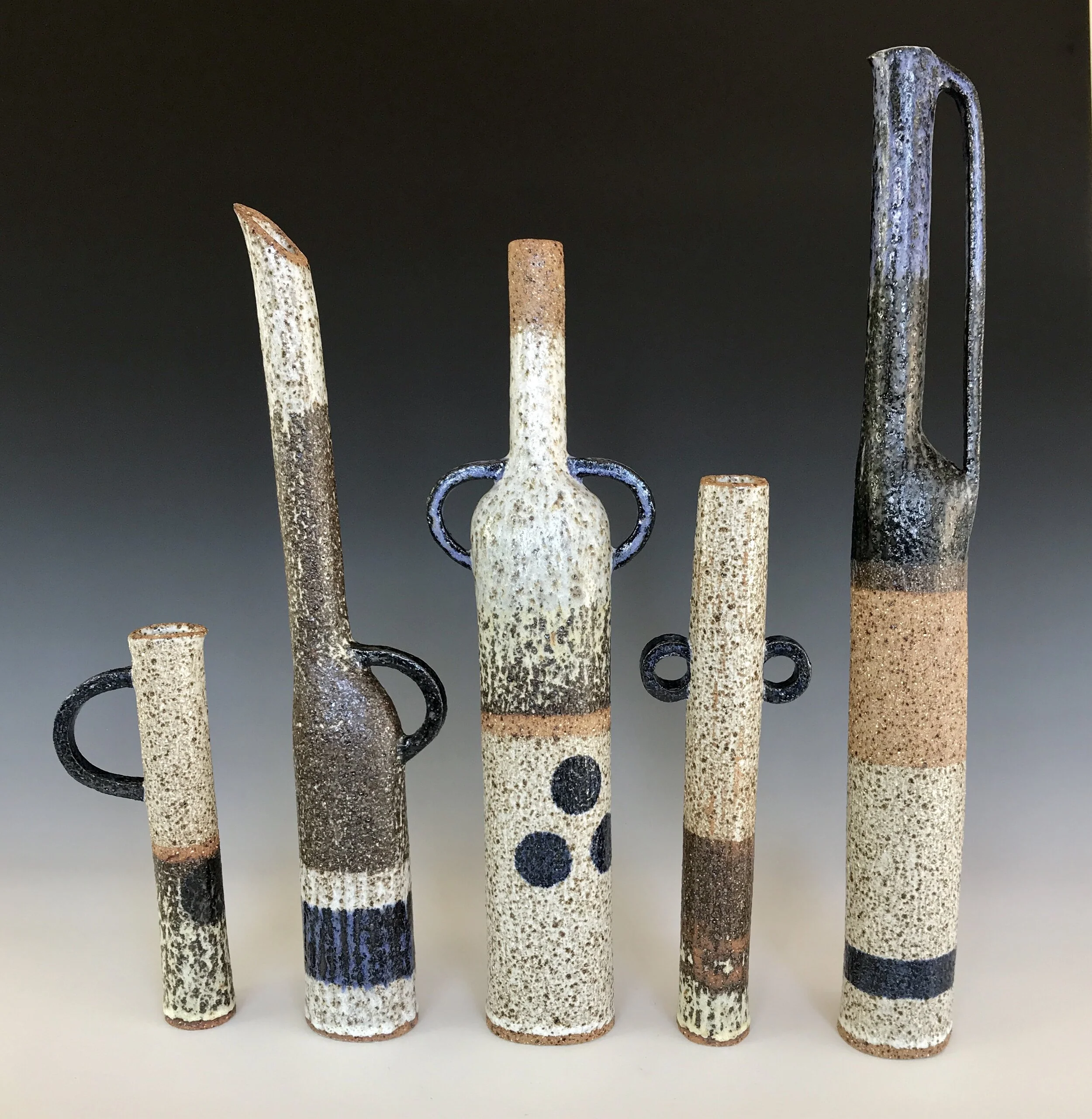 This collection is inspired by modern ceramic forms from the 1950’s, creating strong graphic shapes, tall thin vessels with quirky handles once grouped together look like a family of giacometti sculptures.